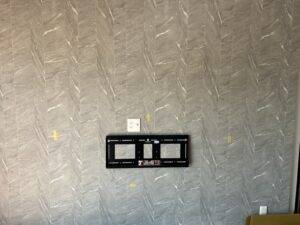 施工前の写真では、ふかし壁の状態が確認でき、十分な強度があることを確認してから作業を開始しました。また、HAMILeX(ハミレックス)製の壁掛け金具の取り付け位置を事前にマーキングし、水平・垂直を測定しました。
